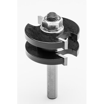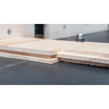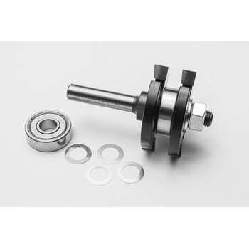 Zweischneidige Nut-und Federgarnitur für stabile Steckverbindungen mit Holzstärken bis zu 19 mm. Das Scheibennutmesser und das Kugellager können auf dem Aufnahmedorn in ihrer Anordnung verändert bzw. entfernt werden, um verschiedene Variationen zu fräsen.