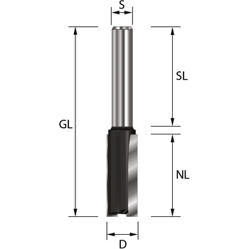 Zweischneidiger Nutfräser zum Nuten, Falzen und Langlochfräsen. Mit angeschliffener Grundschneide für glatte und ausrissfreie Kanten.