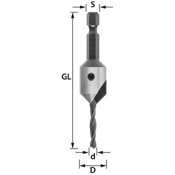 Pilotbohrer zum gleichzeitigen Bohren und Ansenken in einem Arbeitsgang. Zum Beispiel zum Bohren von Terrassendielen. Sechskantschaft passend für alle Standard Bitaufnahmen. Die Bohrtiefe lässt sich individuell einstellen. Der Senker besitzt eine optimale Spangeometrie für ausrissfreie Senkung. Geeignet für Weichholz und speziell für exotisches Hartholz. Speziell geeignet für den Einsatz mit Akku-Bohrmaschinen.