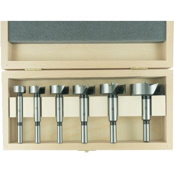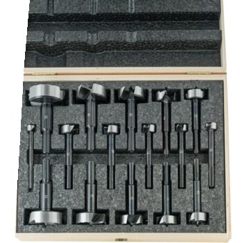 Forstnerbohrer-Set in schöner Holzkassette. Bohrer nach DIN 7483G mit Zentrierspitze, Peripherieschneide, 2 Schneiden und abgesetztem zylindrischem Schaft. Durch die große Auswahl an Durchmessern haben Sie immer den richtigen Forstnerbohrer zur Hand.