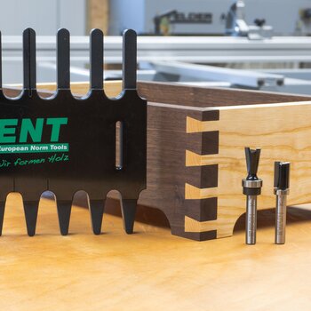 Mit diesem Kombinationsset aus metrischer Zinkenfrässchablone und dazu passenden Fräsern erstellen Sie Zinken- und Schwalbenschwanzverbindungen im Handumdrehen. Um die genaue Ausrichtung der Schablone zu bestimmen sind alle wichtigen Markierungen auf der Schablone vorhanden. Eine Anschlagskante auf der Schablone hilft beim exakten Anlegen des Werkstücks. Aufgrund ihres durchdachten und kompakten Designs entfällt das Erstellen von Arbeitsschablonen vor dem eigentlichen Zinkenfräsen komplett. Ob für Korpus-Verbindungen in der Massivmöbelherstellung, für Schubkästenverbindungen oder für spezielle Projekte wie Holzschatullen - die Schwalbenschwanzverbindung kann individuell genutzt werden und überzeugt gleichzeitig durch ihre schöne Optik.