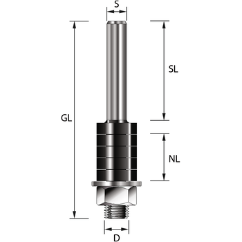 Aufnahmedorn ohne Kugellager zur Aufnahme von Scheibennutmessern. Jeder Aufnahmedorn wird mit geschliffenen Präzisions-Zwischenringen geliefert, sodass eine genaue Aufnahme des Scheibennutmessers und eine exakte Nutbreite gewährleistet ist.