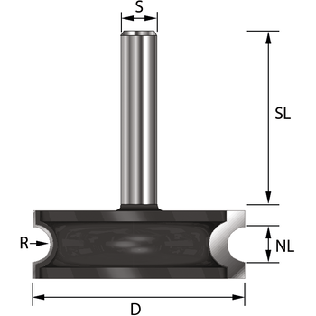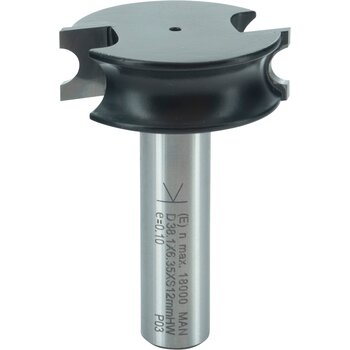 Zweischneidiger Rundfräser mit konvexem Radius zur Herstellung halbrunder Leisten. Zusammen mit konkavem Rundfräser für die Herstellung von Rollläden verwendbar.