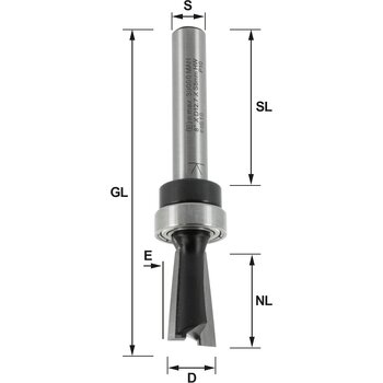 Zinkenfräser, mit dem in Verbindung mit Zinkenfrässchablonen stabile Finger- und Schwalbenschwanzzinken hergestellt werden können. Das Kugellager mit metrischen Abmessungen sorgt für präzise Führung entlang der Kontur. Optimal in Verbindung mit der metrischen ENT Zinkenfrässchablone einsetzbar.