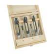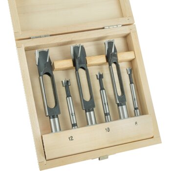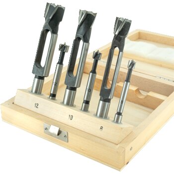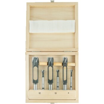 Kombinations-Set bestehend aus drei Zapfenschneidern und drei dazu passenden Forstnerbohrern. Zum Herstellen von Holzdübeln und Zapfen für Astlöcher, zum Verbergen von Schraubverbindungen, sowie zum Reparieren von Holzbeschädigungen geeignet. Alle Zapfenschneider mit Peripherieschneide und zylindrischem Schaft. Lieferung in schöner Holzkassette.